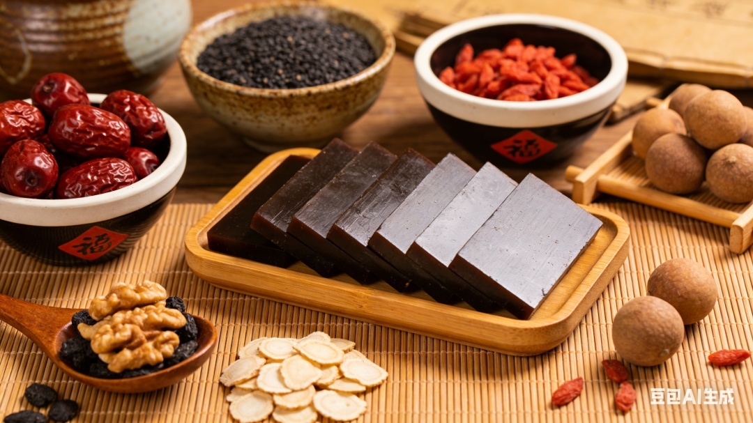 阿胶以养血为主,尤其适合贫血人群,可再加上黑芝麻、核桃仁、黄酒、枸杞子等食材熬制成阿胶糕,益气补血、滋补肝肾,作用更全面。